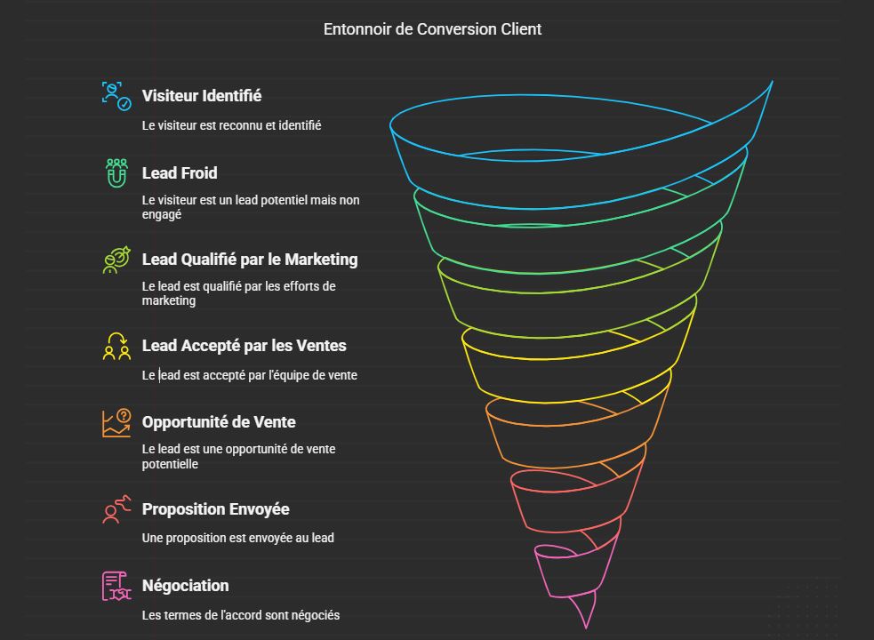 Test 2. Nous avons également testé l’outil avec un texte non chiffré : « Visiteur anonyme → Visiteur identifié → Lead froid → Lead qualifié par le marketing (MQL) → Lead accepté par les ventes (SAL) → Opportunité (SQL) → Proposition envoyée → Négociation → Client signé → Onboarding → Upsell/Cross-sell ». Voici le résultat, sans aucune modification.