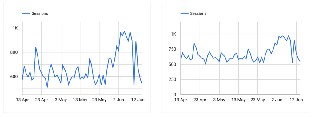 Comparons les deux graphiques suivants, qui documentent les sessions d’un site web pendant deux mois. Les deux graphes représentent exactement les mêmes données, mais l’effet visuel est différent à cause de l’utilisation astucieuse des échelles. A gauche, nous avons l’impression de fluctuations majeures à cause de l’échelle resserrée. A droite, les fluctuations semblent plus mesurées.