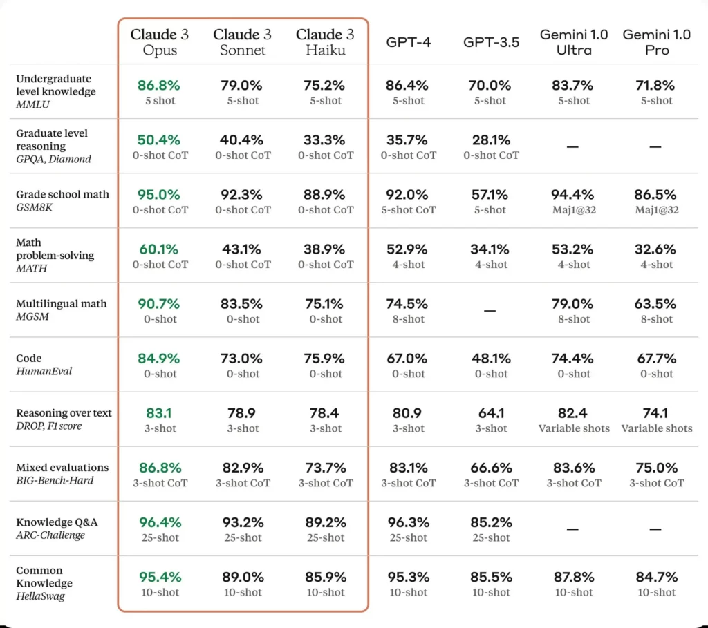 D’après Anthropic, Opus a surpassé la plupart des modèles du marché dans divers tests de benchmark. Il a montré un niveau de raisonnement digne d’un étudiant universitaire, supérieur donc à la capacité de raisonnement de GPT-4 d’OpenAI, avec un score de 50,4 % (vs. 35,7 % pour le produit d’OpenAI). Il s’est également montré plus performant dans la résolution de problèmes mathématiques, en codage et dans la compréhension de raisonnements complexes.